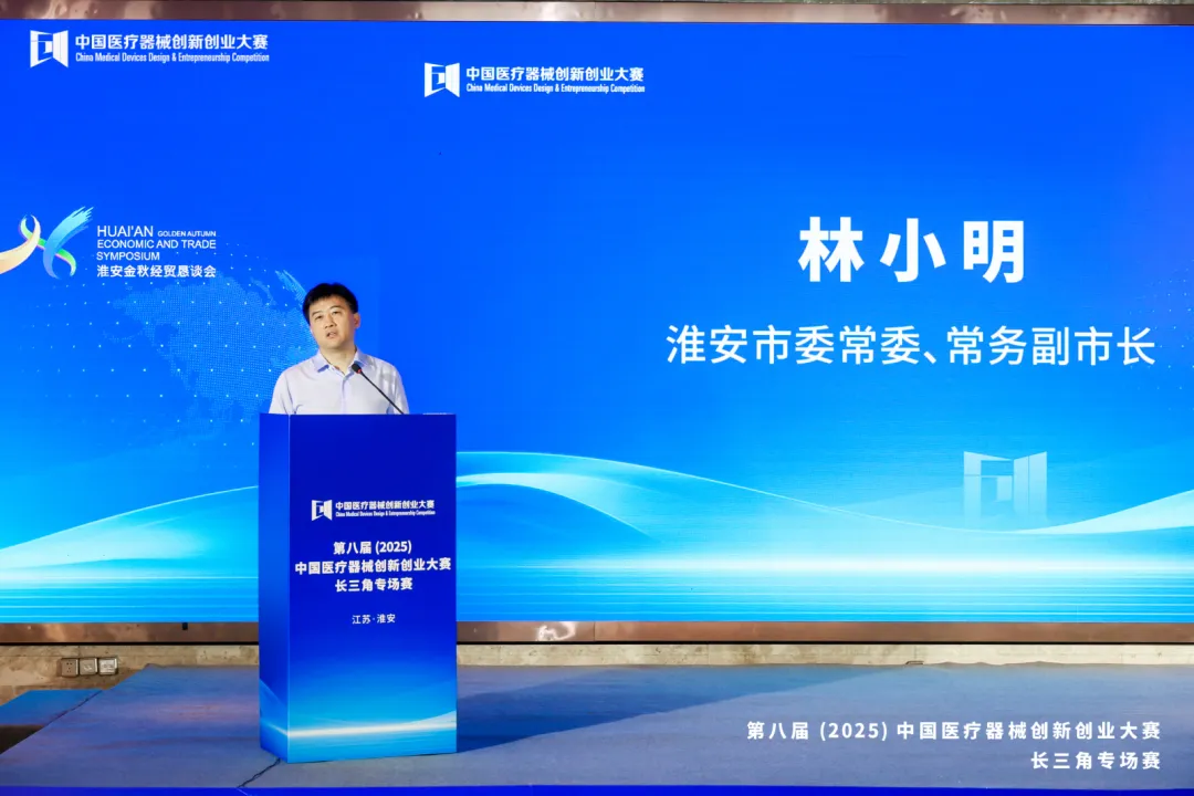 淮安市委常委、常务副市长林小明在致辞中介绍了淮安的城市定位,既点明 “历史文化名城” 底蕴,也强调宜居宜业特质、独特运河文化、便捷交通枢纽三大核心优势。随后聚焦淮安产业发展:作为 “产业新城”,近年聚力推进新型工业化,优化产业布局、塑造产业生态;列举当地特色产业及集群优势,提及电子信息、装备制造的坚实基础,特别强调生物医药与医疗器械领域的产业积淀,还介绍了当地优质相关企业以展现发展潜力。最后,林市长对淮安医疗器械产业未来寄予希冀,希望有更多的创新企业落地淮安。